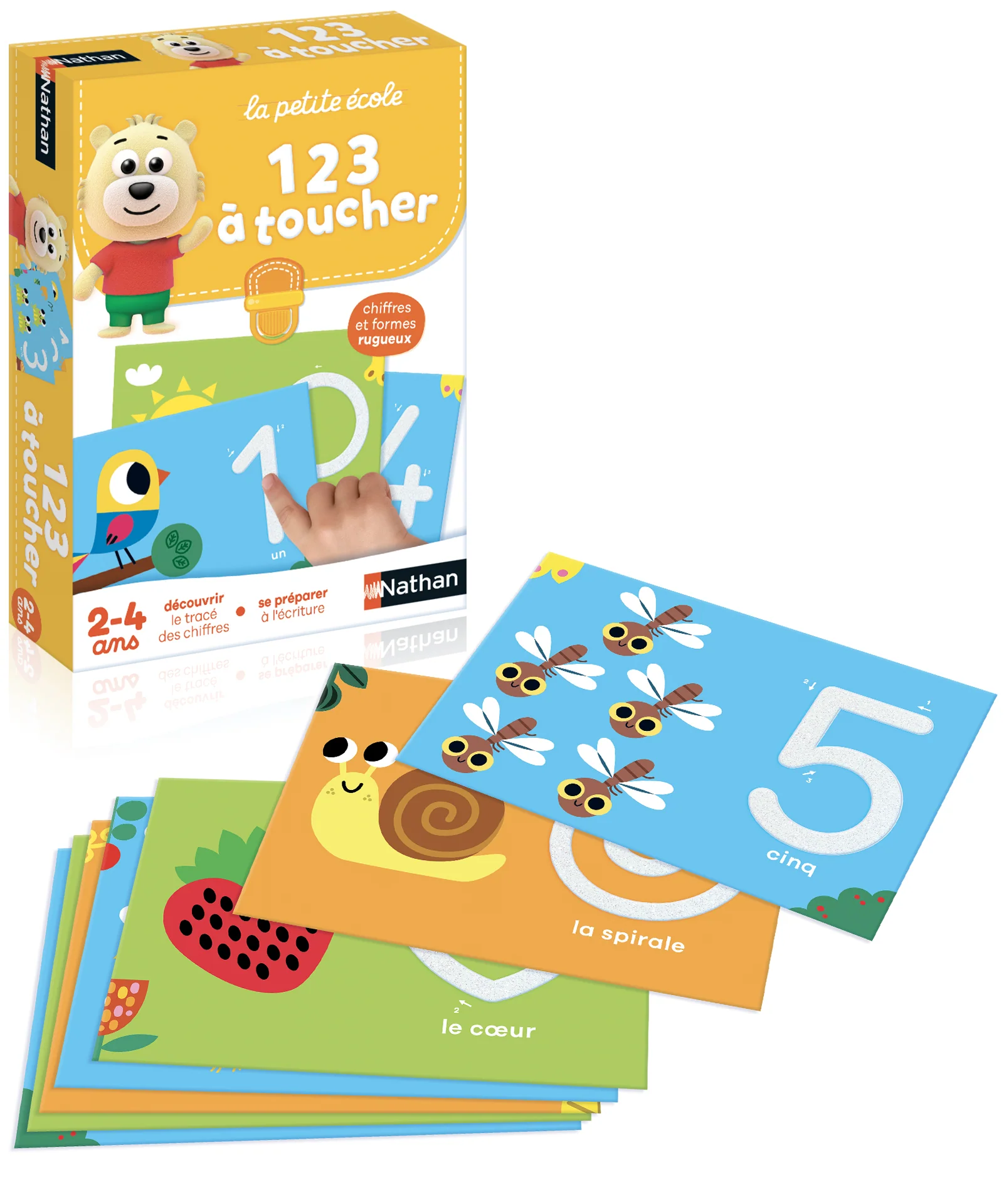 6 jeux progressifs pour découvrir les chiffres, les formes, les gestes graphiques et aborder les quantités. De grandes cartes magnifiquement illustrées avec un tracé rugueux à suivre avec le doigt. « Un petit oiseau posé sur la branche, deux sauterelles sautent dans le pré, trois grenouilles nagent dans la mare… ». En regardant, en touchant et en écoutant le soin des chiffres, l’enfant apprend à reconnaitre et se prépare tout en douceur à l’écriture.