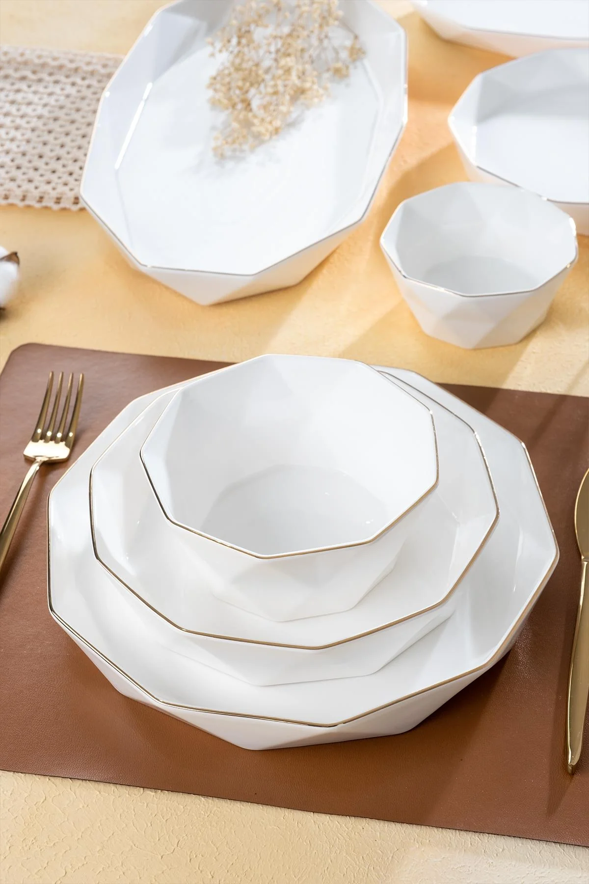 Le liseré doré à la rencontre de la clarté du blanc se croise dans la série Diamond Collection.