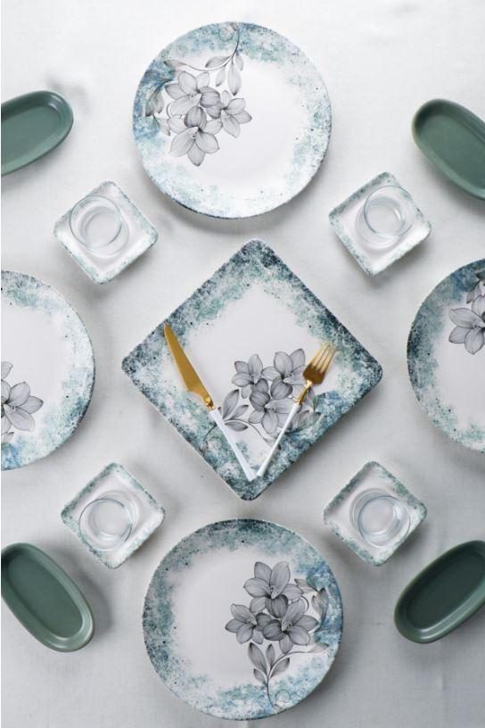ACAR MINT Service petit-déjeuner 4 personnes 17 piècesContenu 1 Assiette plate de service carrée4 Assiettes plates 4 Verres à thé4 Soucoupes4 CoupellesDimensions 25 Cm26 Cm10,5 Cm16 CmMatièreCéramique