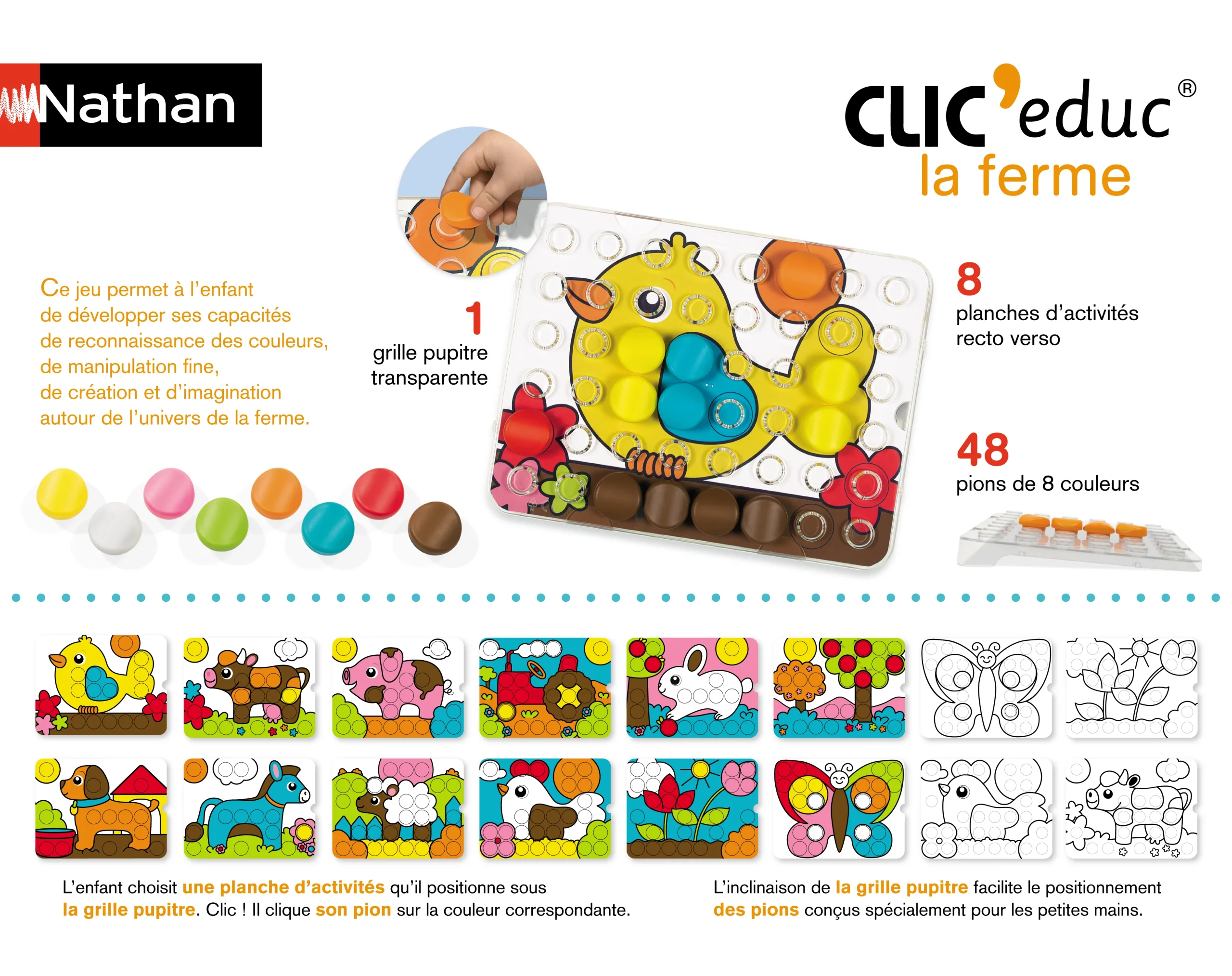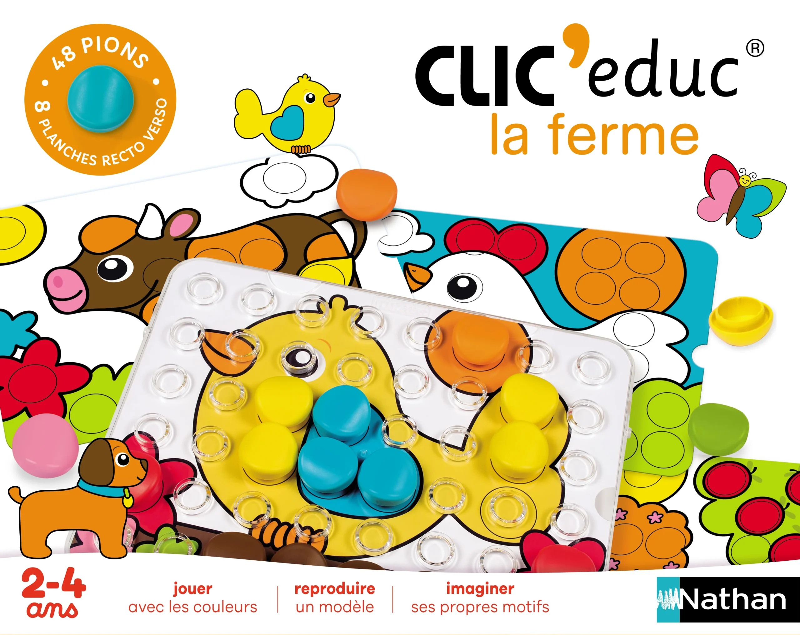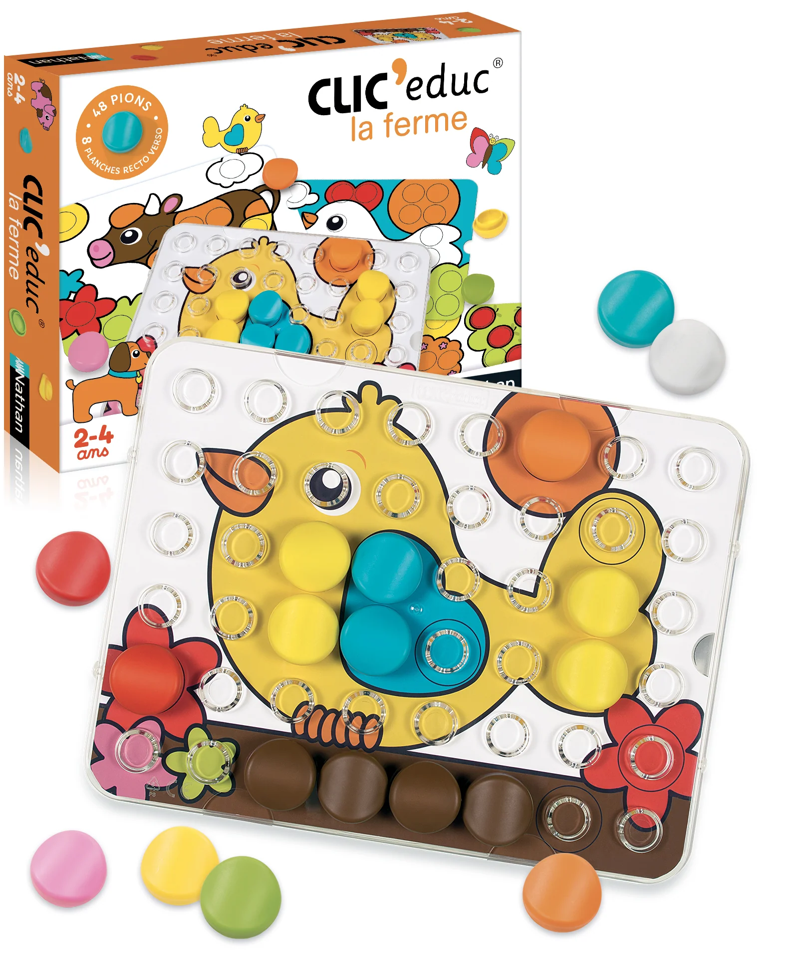 Un jeu de reconnaissance des couleurs, de manipulation fine, d’imagination et de création autour de l’univers de la ferme. L’enfant choisit une planche qu’il place sous la grille transparente et clique ses pions sur la couleur correspondante.