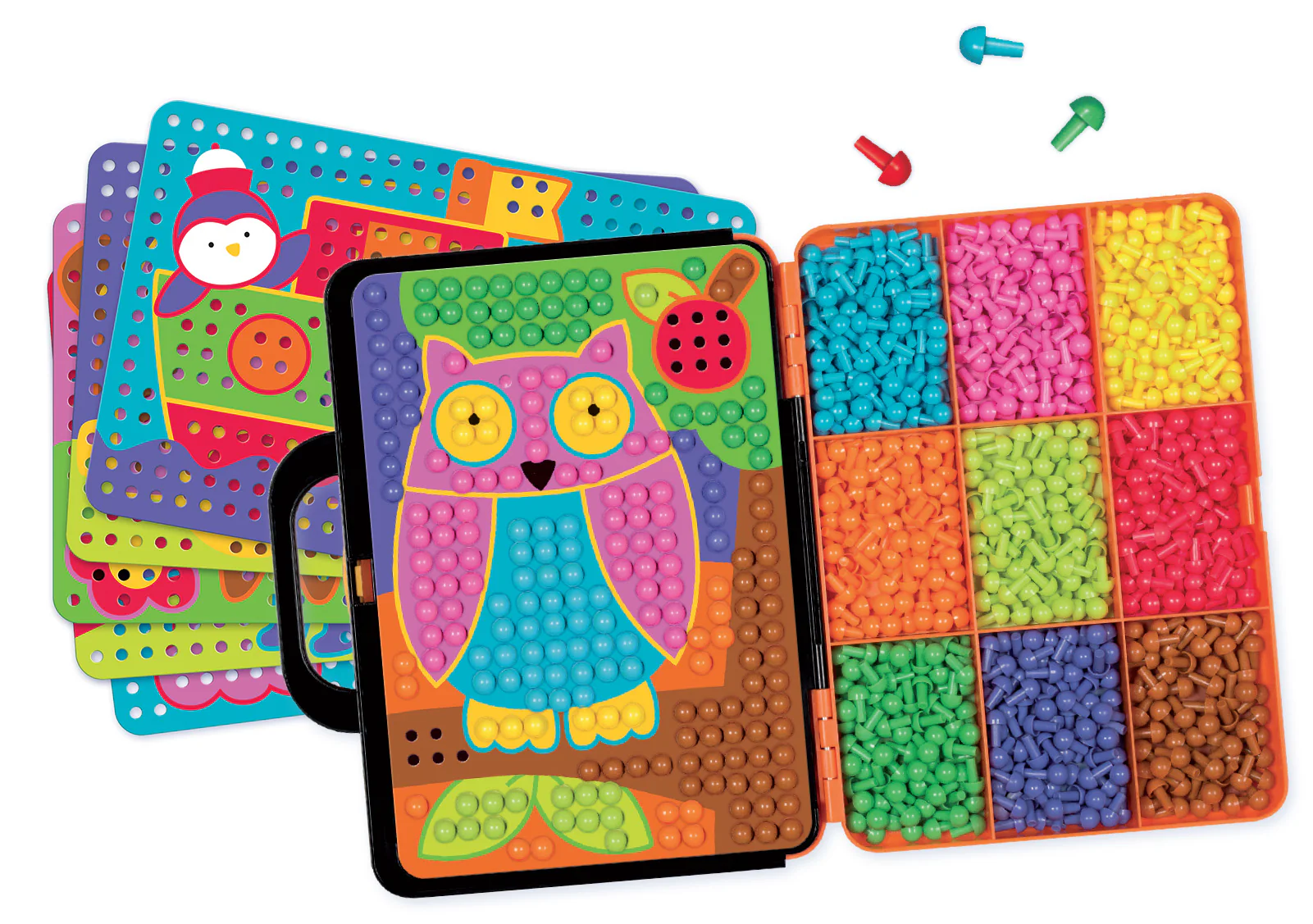 Un jeu de reconnaissance des couleurs, manipulation fine, imagination et création. Avec 10 planches d’activités colorées et 675 pions de 9 couleurs différentes, l’enfant complète et crée ses dessins.