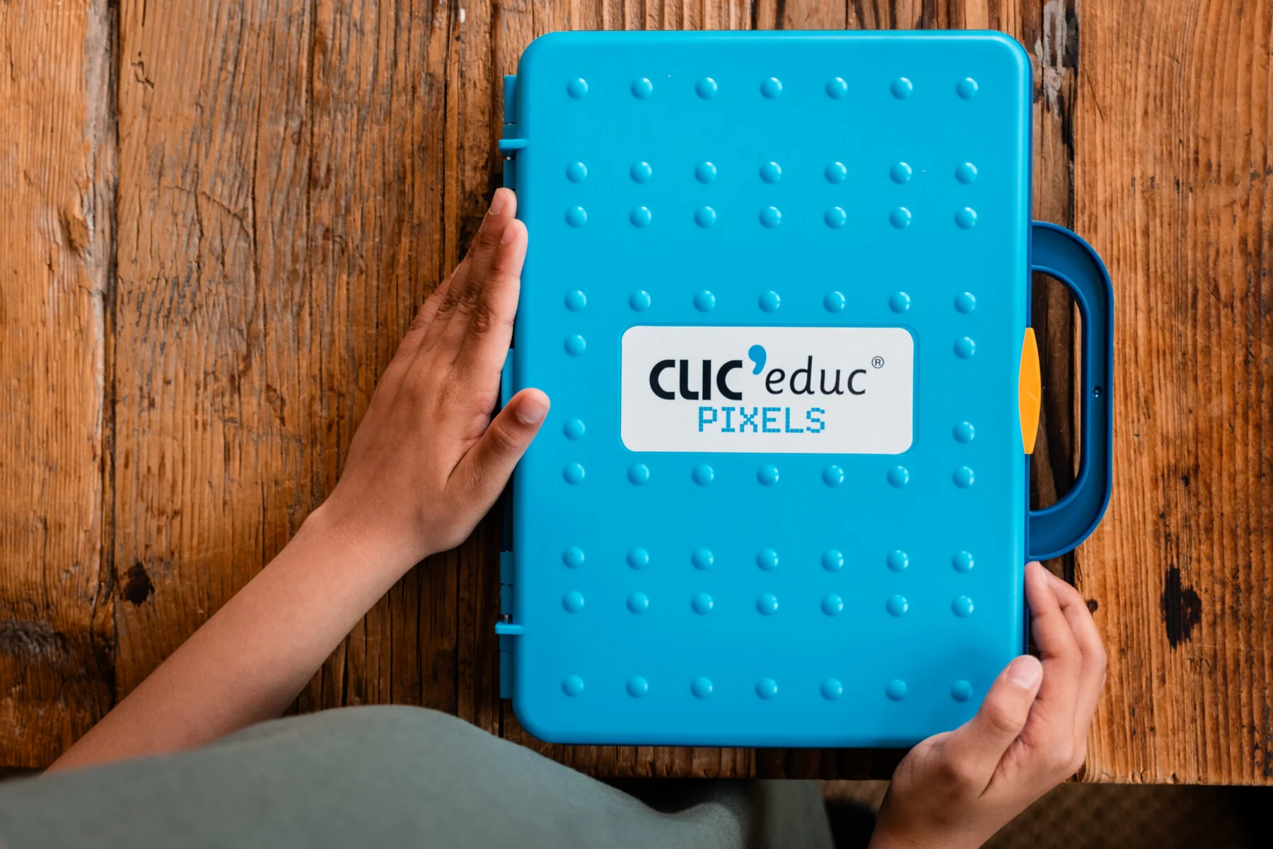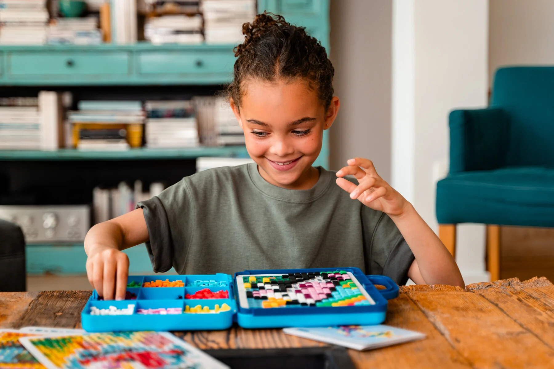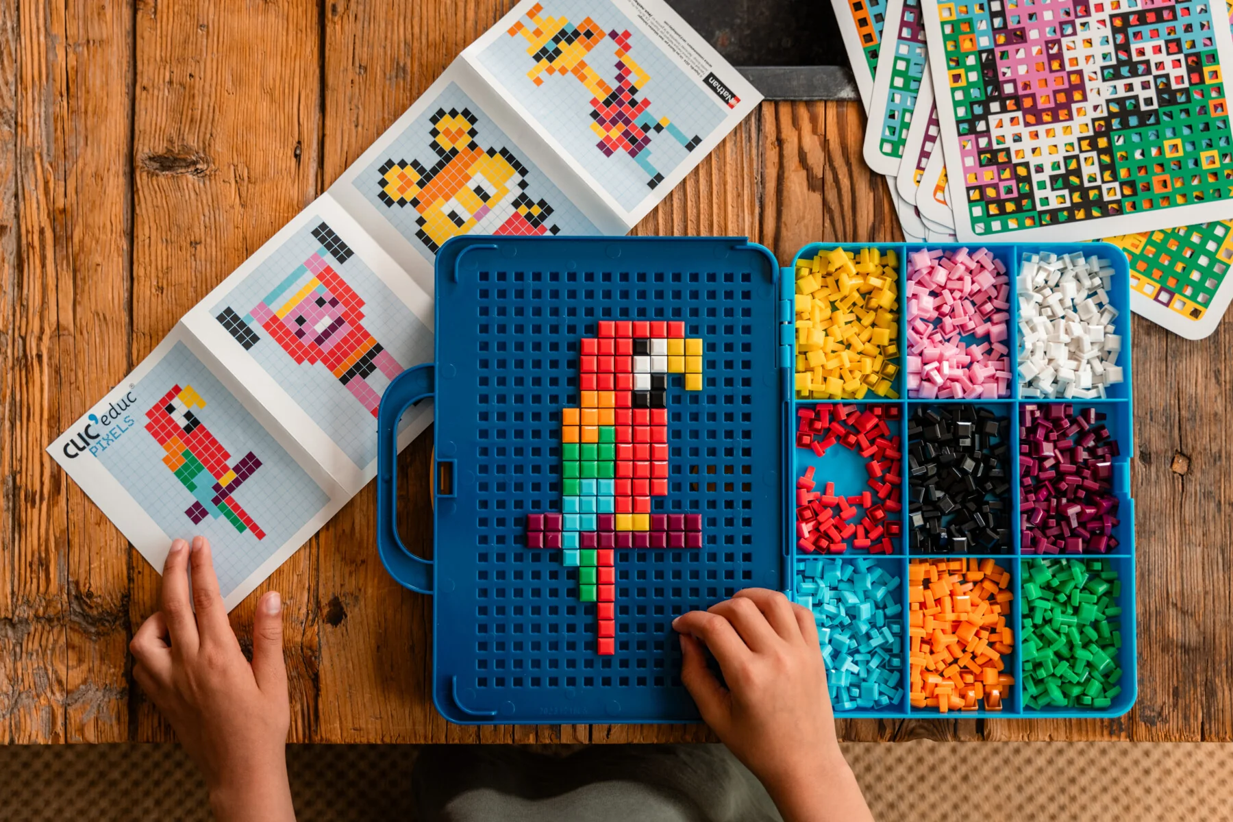 pions de 9 couleurs différentes, l’enfant complète et crée ses dessins.
