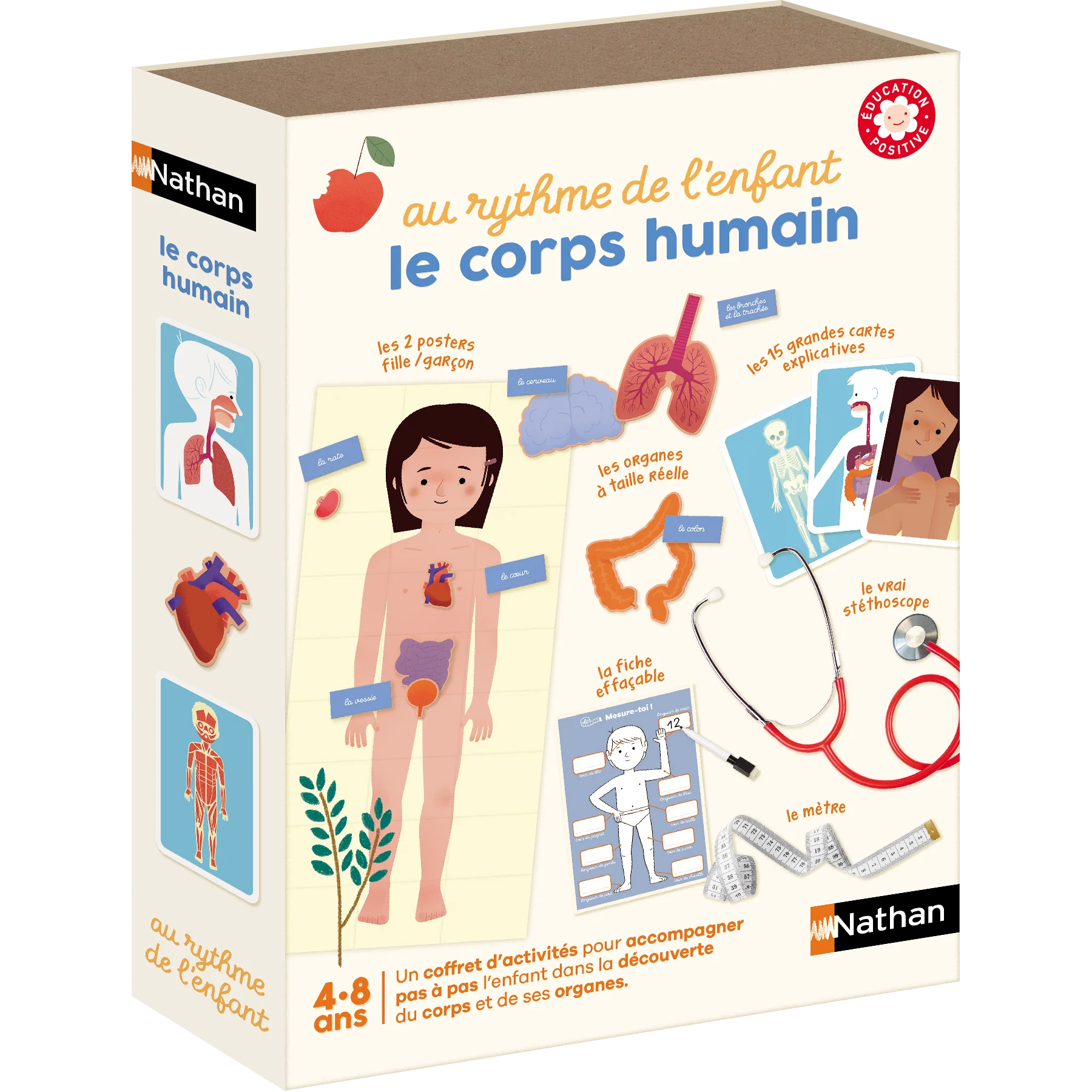 Le coffret d’activités sur la thématique du Corps humain accompagne pas à pas l’enfant dans la découverte du corps humain. L’enfant joue à se mesurer avec le mètre mesureur, complète la fiche de santé effaçable et écoute son cœur avec un vrai stéthoscope. Grâce au poster à taille réelle, il place les organes et découvre comment fonctionne son propre corps. Un jeu qui permet aux plus jeunes d’intégrer leur schéma corporel et de répondre aux questions des plus grands sur le fonctionnement du corps humain. Au total c’est plus de 20 activités à partager en famille.