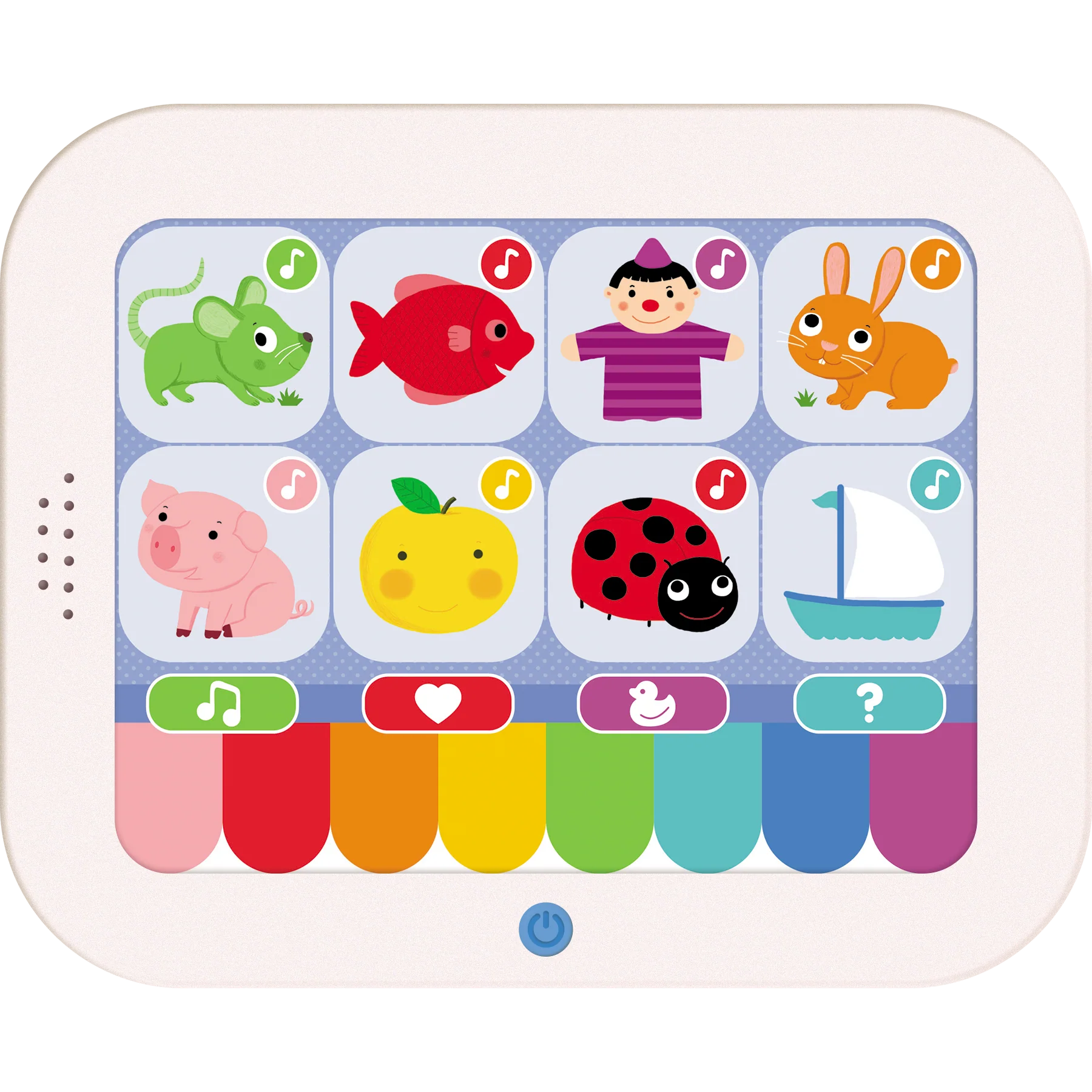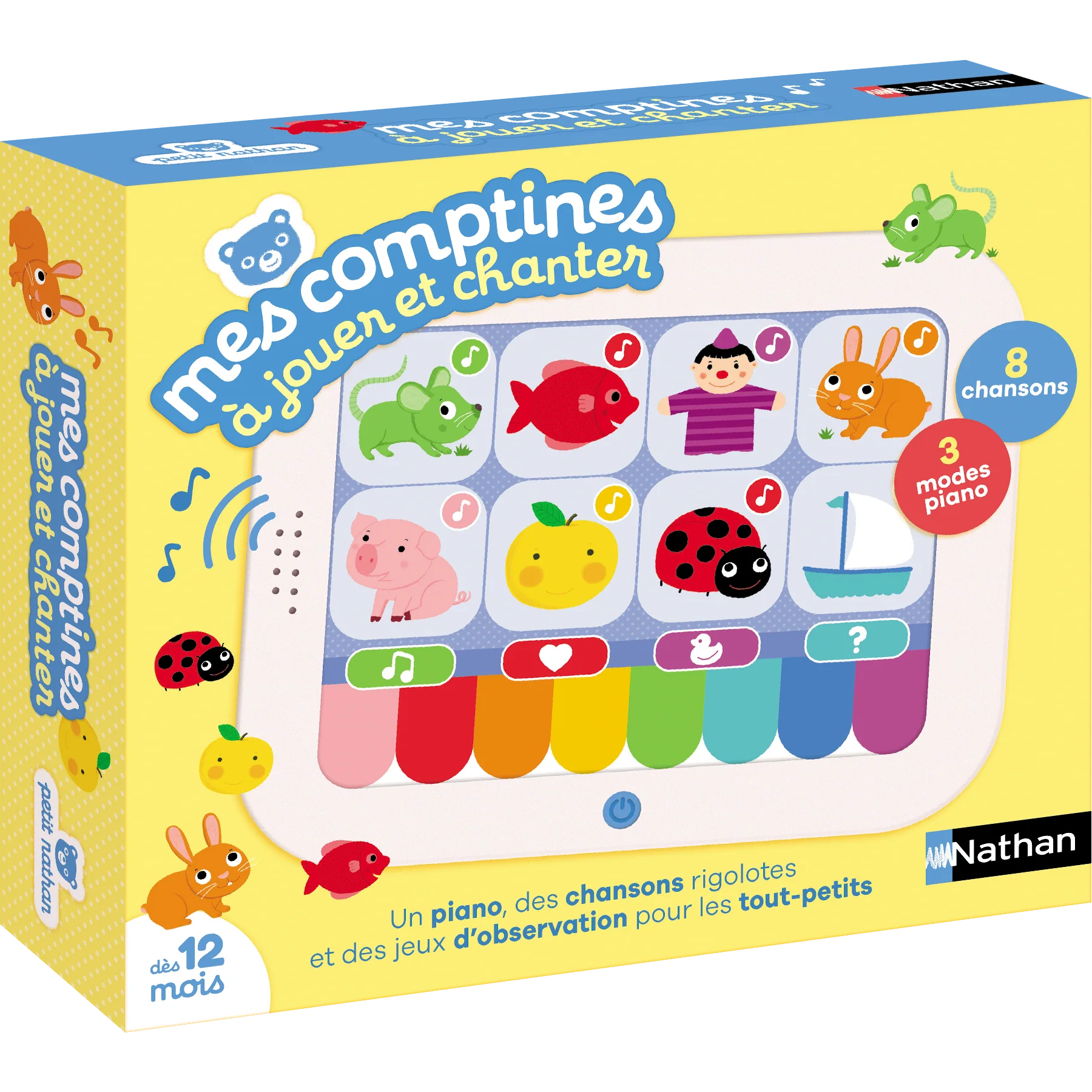Un jeu interactif pour découvrir et chanter 8 comptines incontournables, jouer de la musique avec le petit piano et s’amuser à répondre aux questions. 8 comptines, 3 modes piano (musique, bruits rigolos, cris de animaux), 1 mode question