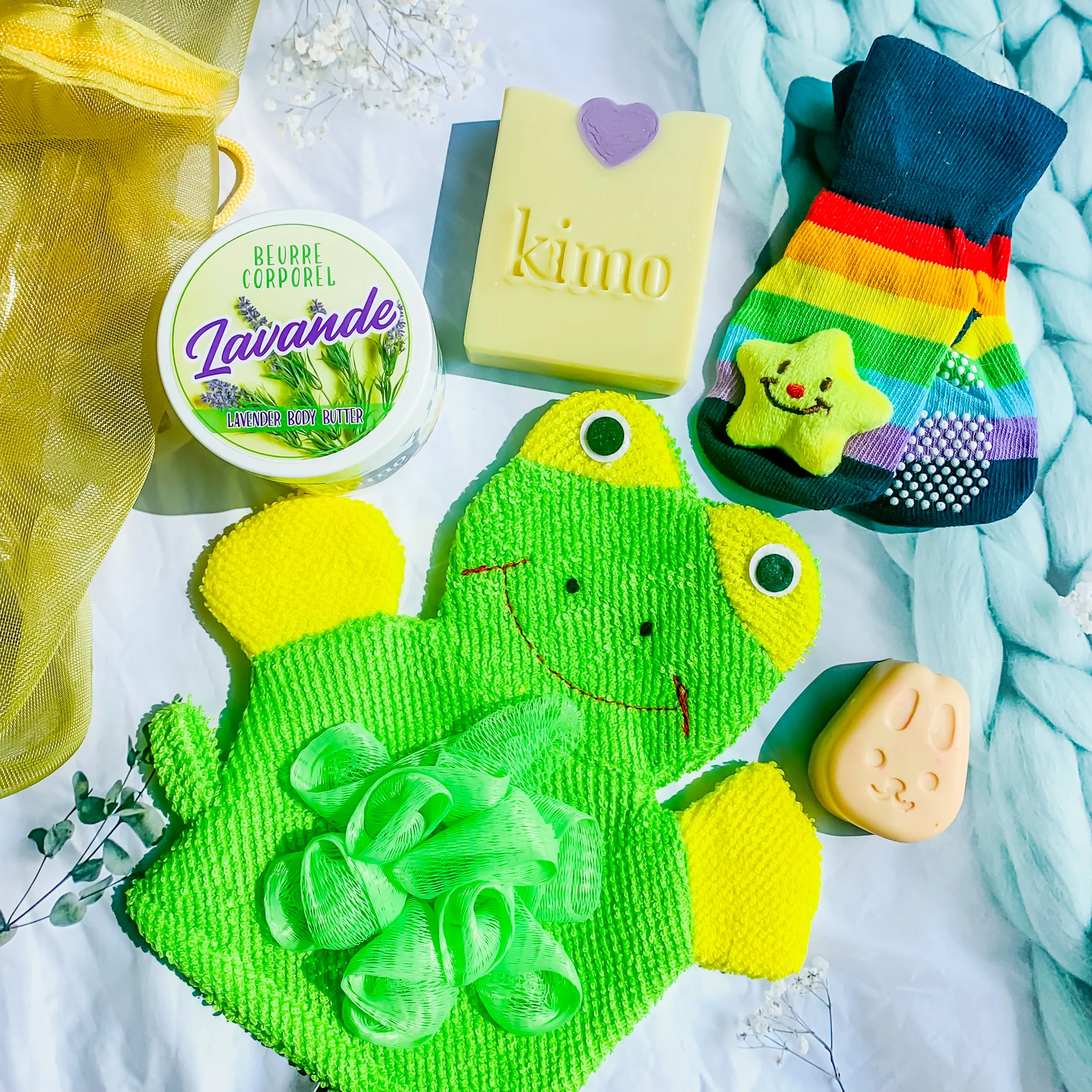 - 2 savons naturels : un savon pour bébé à la lavande et un petit savon mignon
