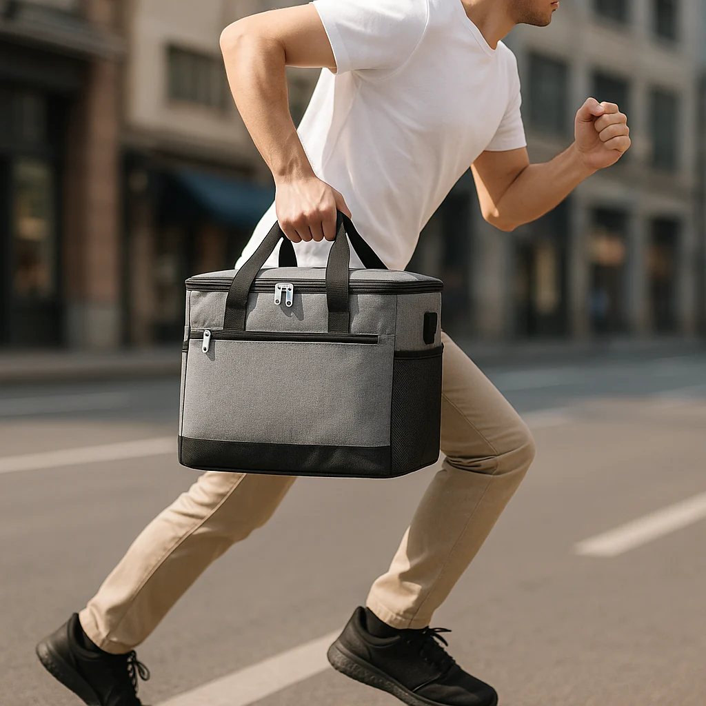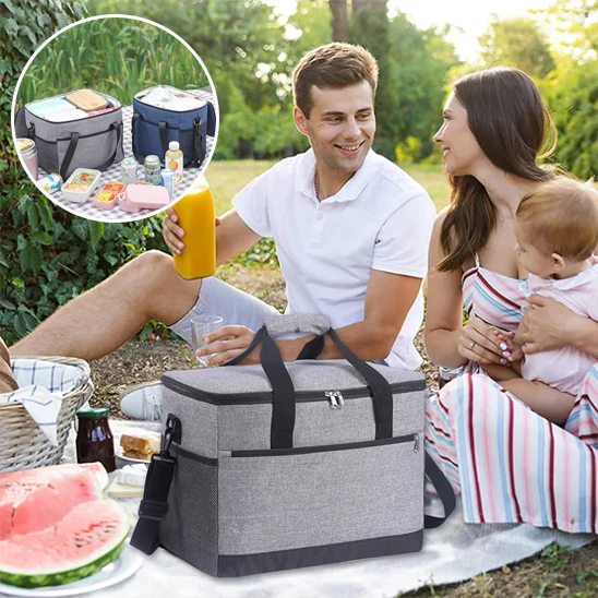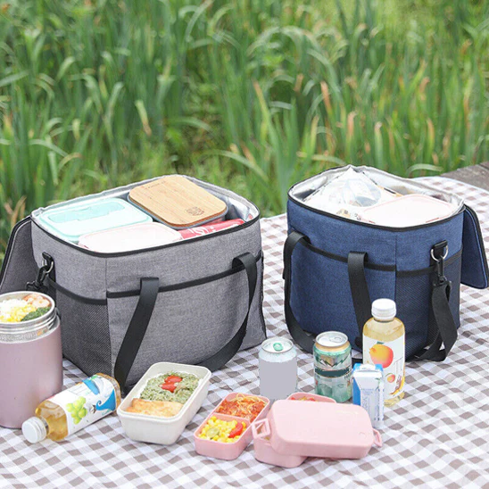 Tissu Oxford épaissi résistant à l’eau, doublure en coton d’isolation thermique dense et film alimentaire. Cette combinaison crée une barrière thermique exceptionnelle qui maintient vos aliments frais pendant des heures, surtout lorsque vous ajoutez des blocs réfrigérants.