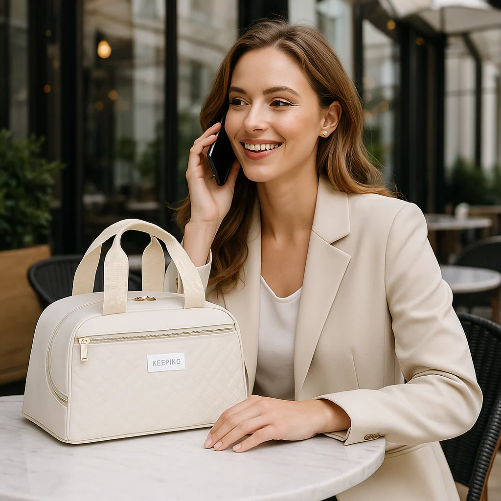 Ce lunch bag beige élégant vous accompagne bien au-delà du cadre professionnel. Vous partez en randonnée ce weekend ? Emportez vos collations et boissons fraîches sans souci. Journée à la plage avec les enfants ? Les fruits et sandwichs resteront frais malgré la chaleur.