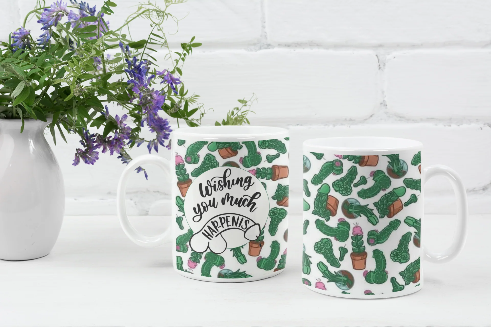 La tasse à café Hap-penis est un drôle de jeux de mots qui saura faire rire entourée de cactus en forme de pénis. Laissez-vous entousiasmer par la tasse: Wishing you much Hap-penis!