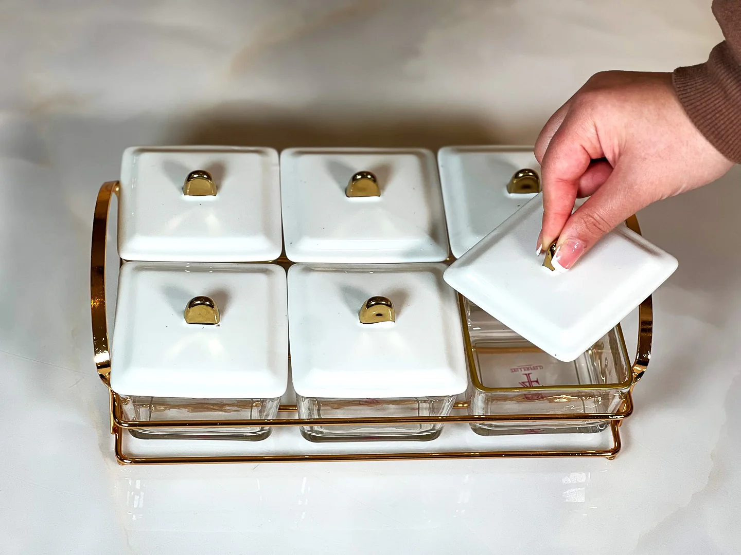 TREND HOME Plateau apéritif avec 6 bols carrés en porcelaine avec couvercle Matière : Bols : verre Couvercle : porcelaine Support : métal