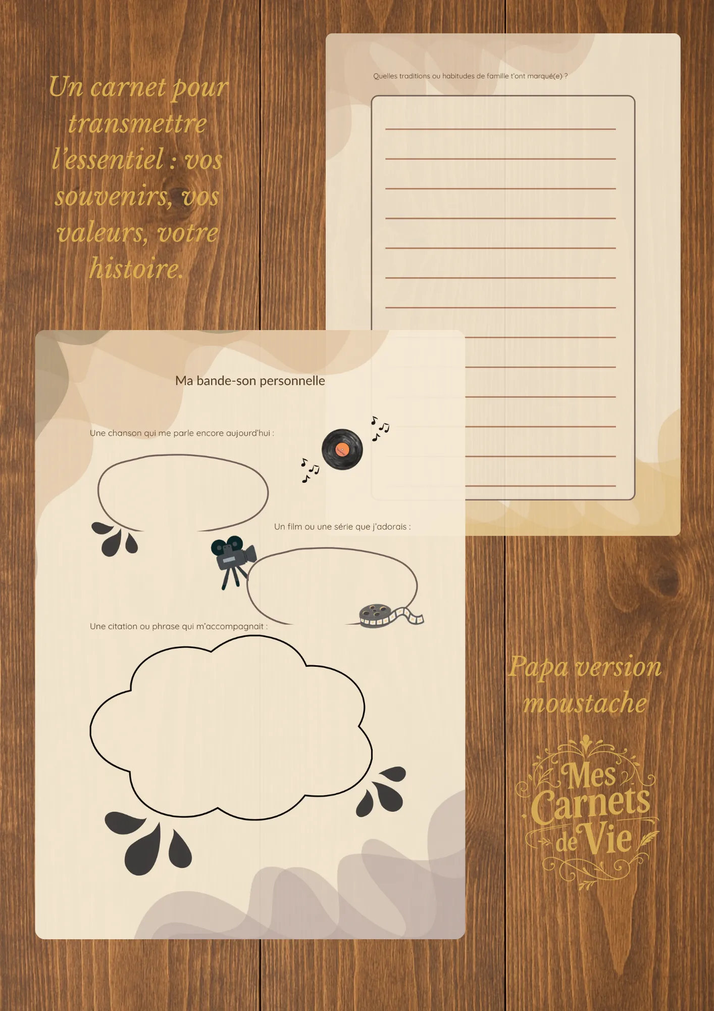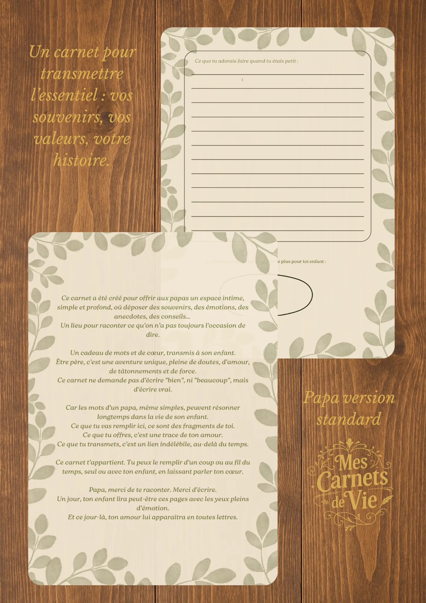 Caractéristiques du carnet : 📘 83 pages guidées 📐 Format A4 🖐️ Couverture souple 📝 Espaces d’écriture, photos et souvenirs Ce carnet permet de : Raconter les souvenirs d’enfance et d’adolescence Partager son parcours de vie, ses passions, ses forces et ses doutes Raconter le moment où l’on est devenu père et ce que cela […]