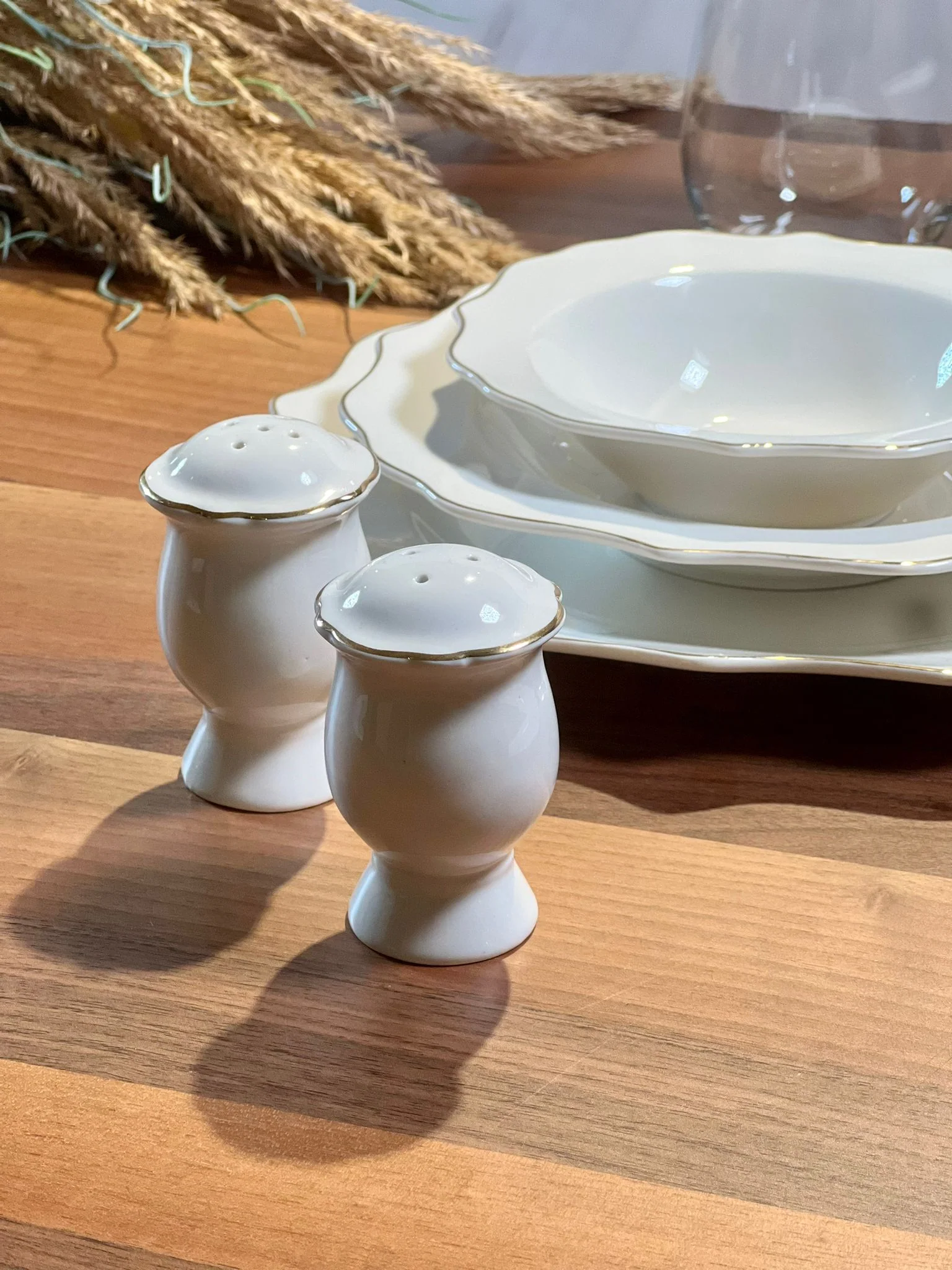 ZELLERFELD LADY Service de table blanc/doré 27 pièces 6 personnes Contenu : 6 Assiettes plates 6 Assiettes à dessert 6 Assiettes creuses 6 Bols 1 Saladier 1 Salière 1 Poivrière Matière : Porcelaine Ne convient pas pour le lavage au lave-vaisselle. Le lavage à la main est recommandé.