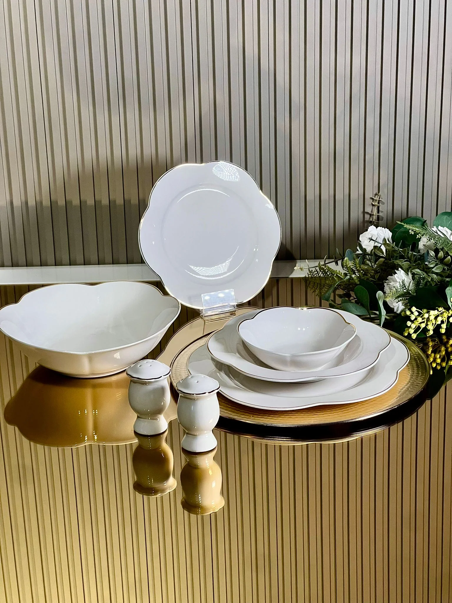 ZELLERFELD ROSA Blanc avec liseré doré Service de table 27 pièces 6 personnes Contenu : 6 Assiettes plates 6 Assiettes à dessert 6 Assiettes creuses 6 Bols 1 Saladier 1 Salière 1 Poivrière Matière : Porcelaine Le lavage à la main est recommandé.
