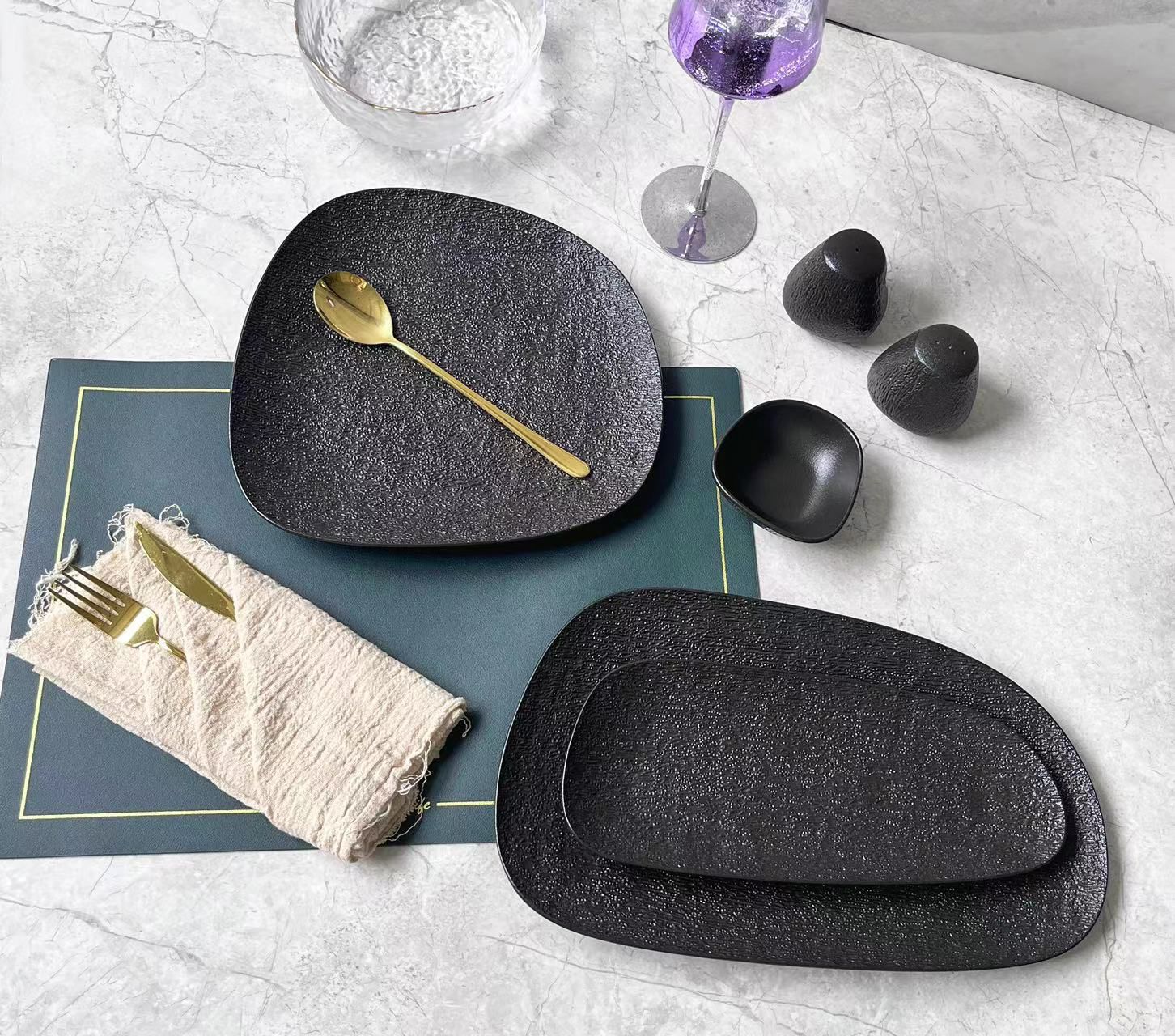 ZELLERFELD TREND Service petit-déjeuner noir 17 pièces 6 personnes Contenu : 6 Assiettes de service 6 Coupelles 1 Grande assiette ovale 2 Petites assiettes ovales 1 Salière 1 Poivrière
