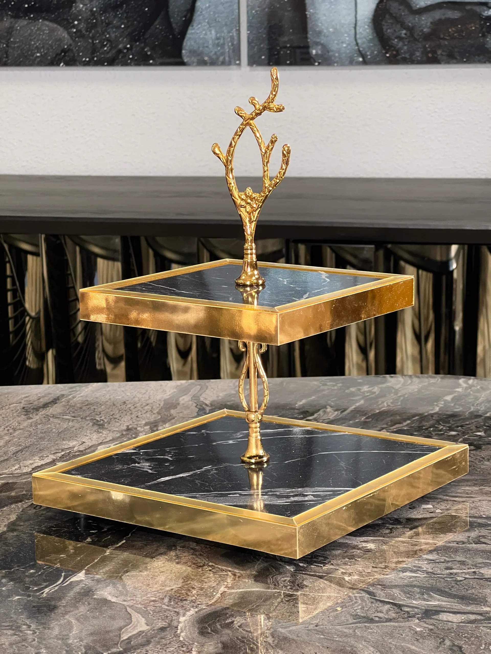 ZEYVE Présentoir à gâteau 2 étages motif marbré noir doré
